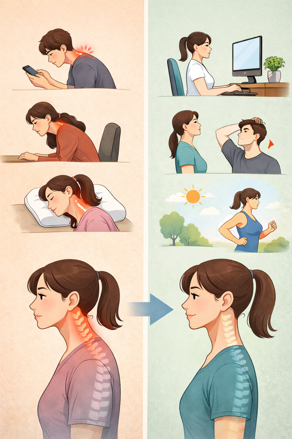 거북목을 예방하기 위해서는 먼저 스마트폰과 컴퓨터 사용 자세를 점검하는 것이 중요합니다. 스마트폰을 사용할 때는 화면을 눈높이에 가깝게 올리는 것이 도움이 될 수 있습니다. 이렇게 하면 고개를 숙이는 각도를 줄일 수 있습니다. 컴퓨터 작업을 할 때는 모니터 높이를 눈높이에 맞추는 것이 좋습니다. 이렇게 하면 고개를 숙이는 자세를 줄일 수 있습니다. 또한 의자에 앉을 때 허리를 곧게 펴고 등받이를 활용하면 자세를 안정적으로 유지하는 데 도움이 됩니다. 장시간 같은 자세를 유지하지 않는 것도 중요합니다. 일정 시간마다 몸을 움직이고 목과 어깨를 가볍게 스트레칭하면 근육 긴장을 줄이는 데 도움이 될 수 있습니다. 간단한 목 돌리기나 어깨 스트레칭만으로도 근육 피로를 완화할 수 있습니다. 목과 어깨 근육을 강화하는 운동도 도움이 됩니다. 이러한 운동은 자세를 안정적으로 유지하는 데 도움을 줄 수 있습니다. 특히 등 상부 근육을 강화하면 어깨가 앞으로 말리는 자세를 예방하는 데 도움이 될 수 있습니다. 또한 평소 자세를 자주 점검하는 습관을 만드는 것이 중요합니다. 고개가 앞으로 나와 있지는 않은지 어깨가 앞으로 말려 있지는 않은지 확인하는 것만으로도 자세를 바로잡는 데 도움이 될 수 있습니다. 거울을 보거나 잠깐 몸의 위치를 확인하는 것만으로도 자세 교정에 도움이 될 수 있습니다. 결국 거북목 증후군을 예방하는 가장 중요한 방법은 생활 속 자세 습관이라고 생각합니다. 스마트폰과 컴퓨터를 사용하는 시간이 많은 현대 사회에서는 이러한 자세 관리가 더욱 중요해지고 있습니다. 작은 습관 변화만으로도 목과 어깨의 부담을 줄일 수 있으며 이러한 변화는 장기적으로 몸의 균형을 유지하는 데 도움을 줄 수 있습니다. 건강한 자세는 단순한 외형의 문제가 아니라 몸 전체의 건강과 연결된 중요한 요소입니다. 일상 속에서 자세를 조금만 더 신경 쓰는 것만으로도 목과 어깨의 피로를 줄이고 건강한 생활을 유지하는 데 큰 도움이 될 수 있습니다.